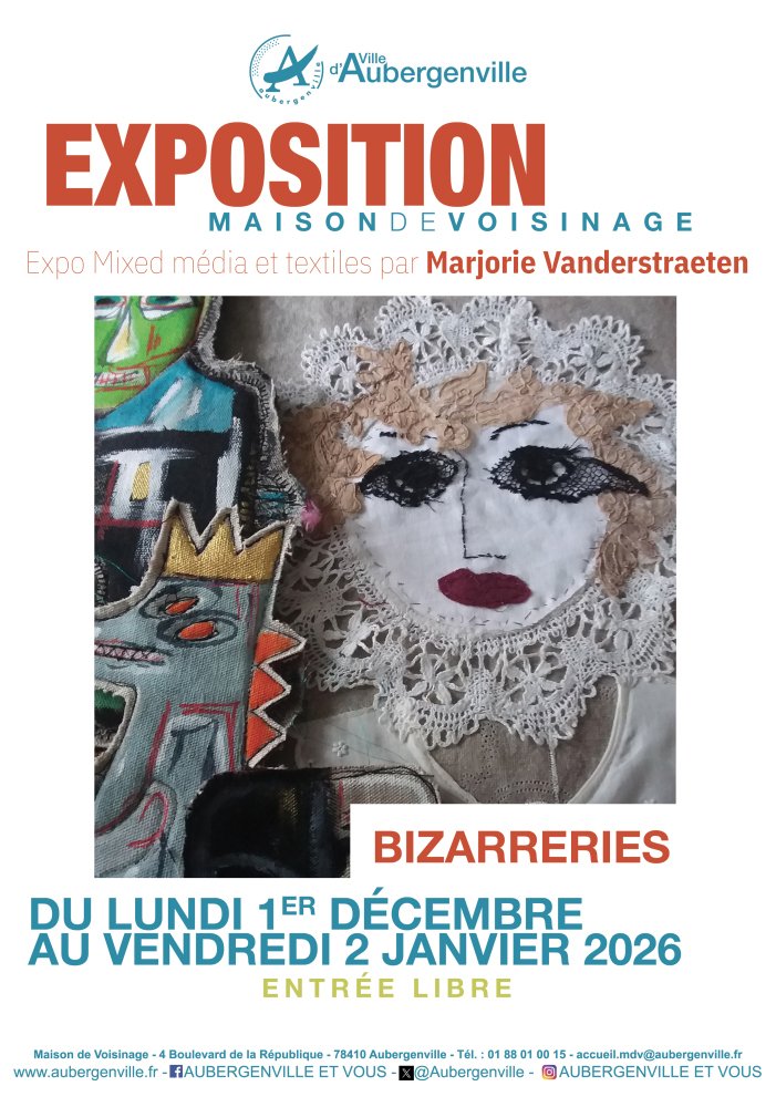 La Ville d’Aubergenville accueille, du lundi 1er décembre 2025 au vendredi 2 janvier 2026, l’exposition BIZARRERIES, signée par Marjorie Vanderstraeten.