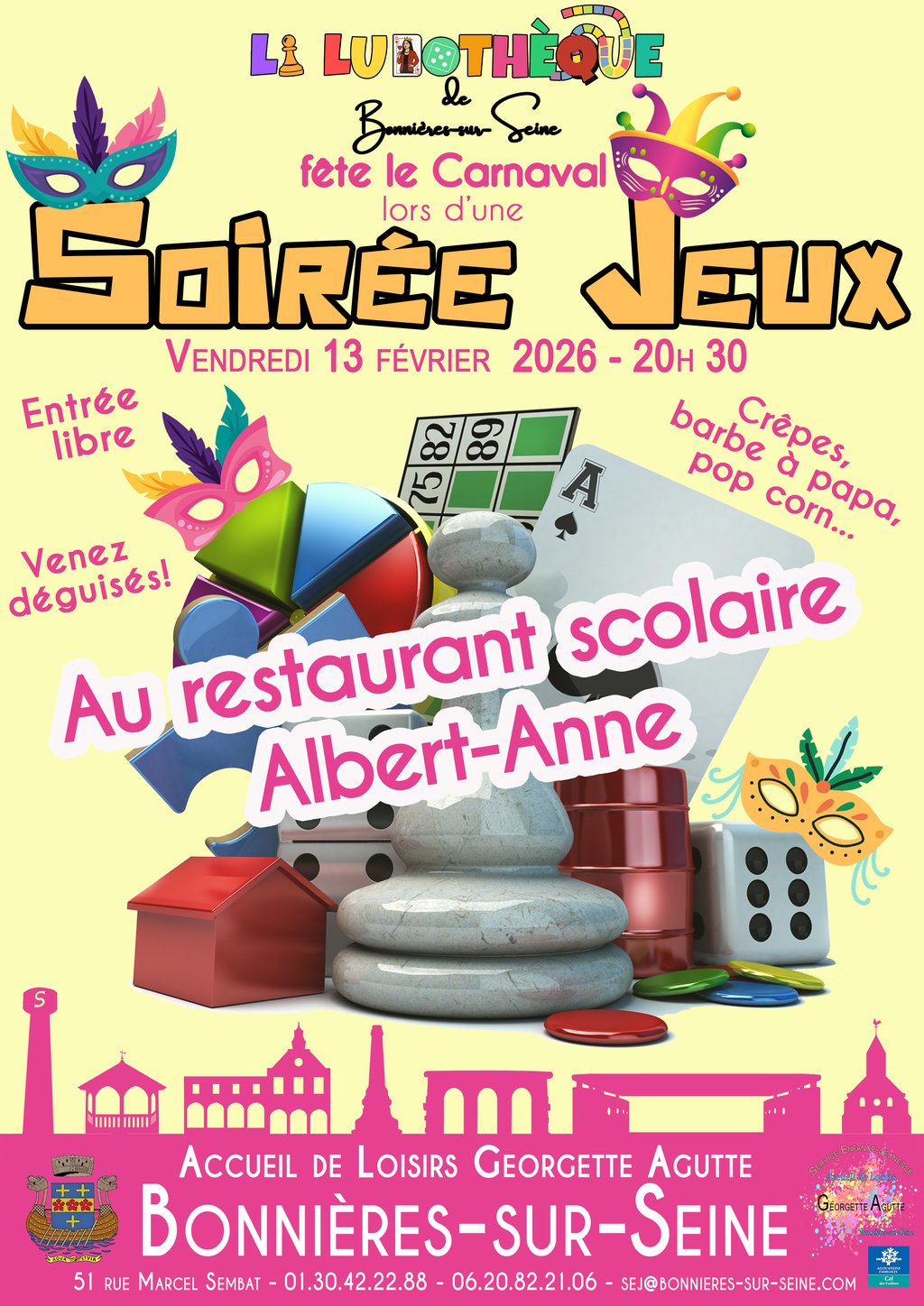 🎲 Le service Enfance-Jeunesse vous donne rendez-vous le vendredi 13 février 2026 pour une soirée jeux au restaurant scolaire de l’école Albert Anne . Des surprises vous y attendent!🎲