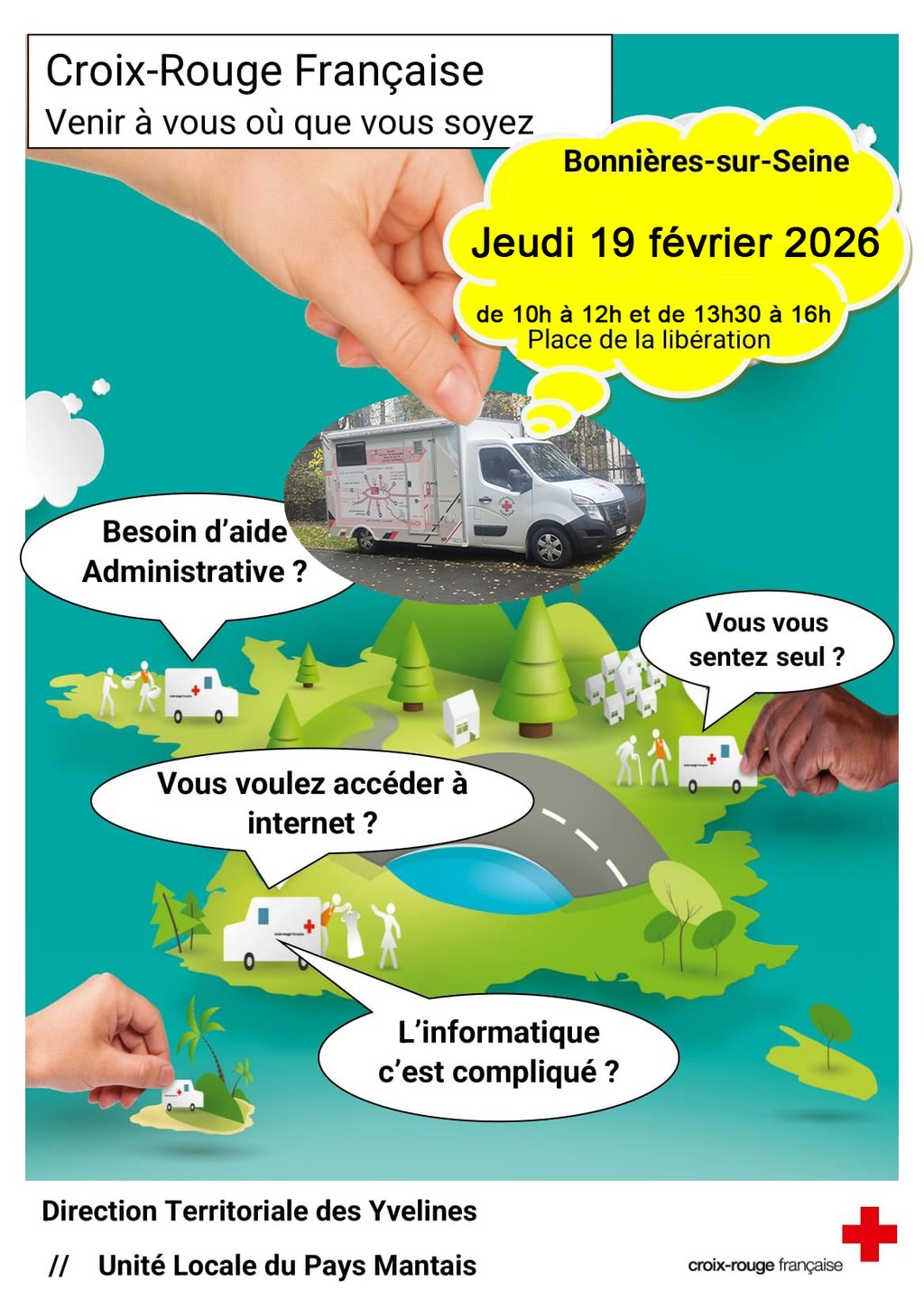L'équipe du bus de la Croix rouge vient à votre rencontre, le jeudi 19 février 2026, de 10h à 12h et de 13h30 à 16h, sur la place de la Libération.