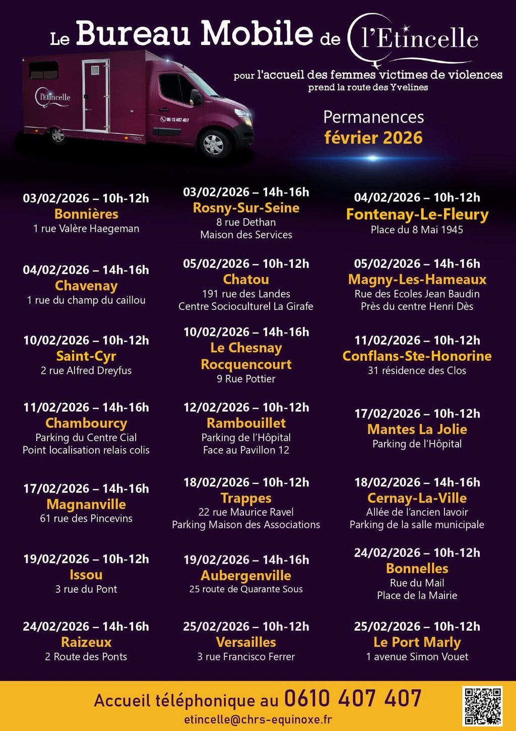 La ville d'Aubergenville accueillera le bus Étincelle, un dispositif itinérant dédié à l'accompagnement et au soutien des femmes victimes de violences, le 19 février de 14h à 16h, sur le parking de la Maison des Associations - 25 route de 40 sous à Aubergenville